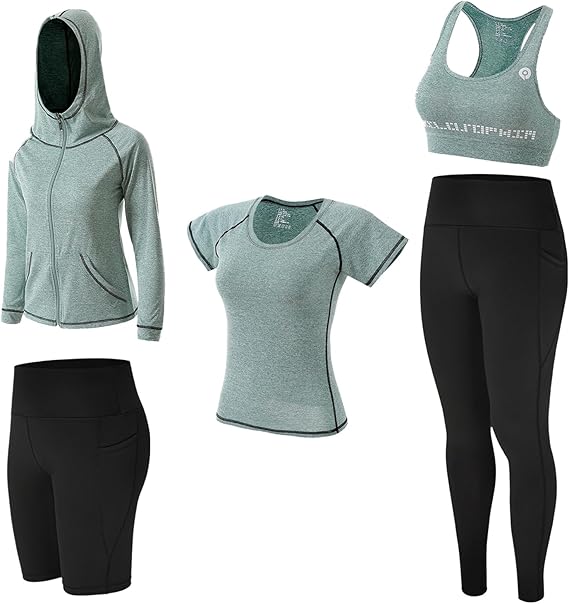 Womens Girls Workout Outfits Clothes Set 5 PCS Exercise Jogging Running Athletic Tracksuits