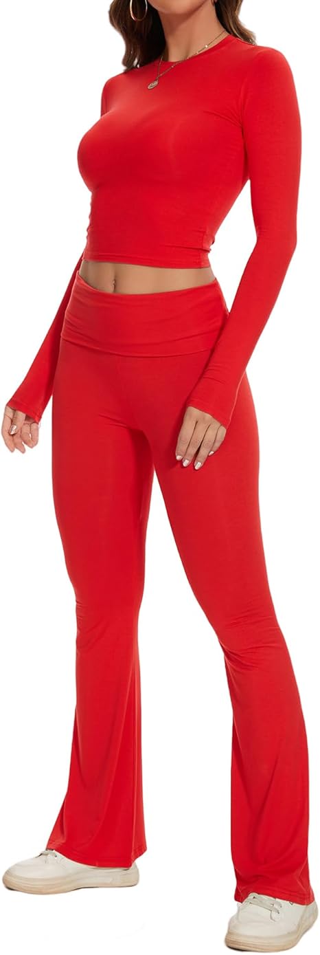 Workout 2 Piece Set Outfits for Women Fold-over Flare Pants Set Lounge Ribbed Knit Pajamas Set Leggings Sets