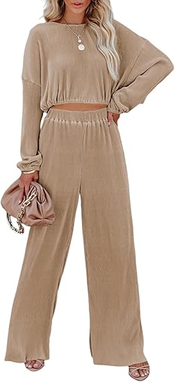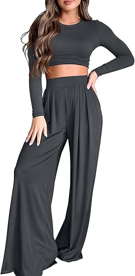 2 Piece Outfits for Women Crewneck Long Sleeve Crop Tops and Wide Leg Pants Sets