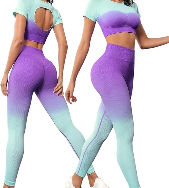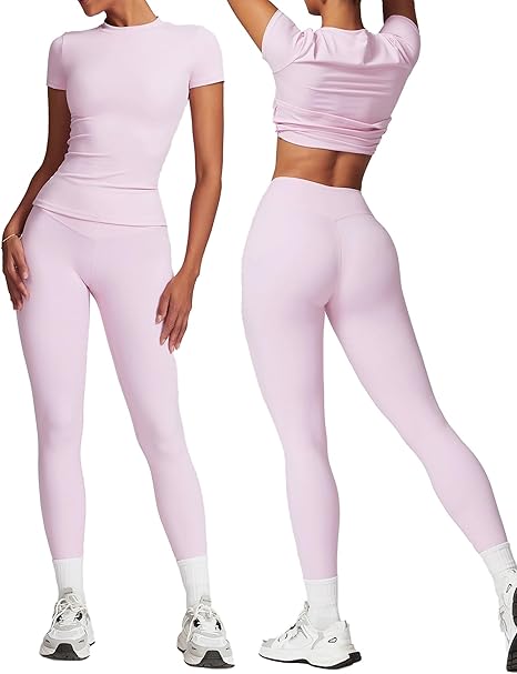 Workout Sets for Women 2 Piece Seamless Crop Top High Waist Ribbed Leggings Athletic Short Sleeve Gym Yoga Outfit