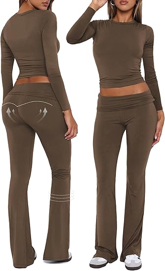 Workout 2 Piece Set Outfits for Women Fold-over Flare Pants Set Lounge Ribbed Knit Pajamas Set Leggings Sets