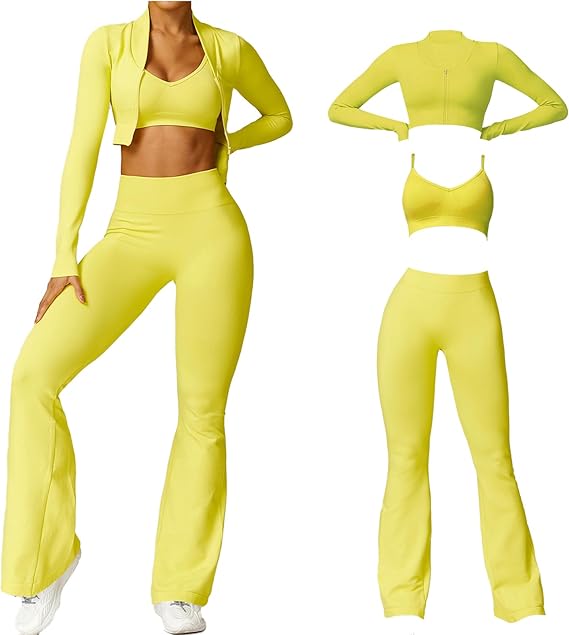 Women's 3 Piece Workout Sets, Seamless High Waist Flare Leggings Sports Bra and Zip Jacket