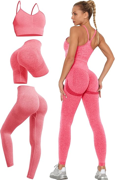 3 Piece Workout Sets for Women Scrunch Butt Lift Leggings Shorts with Pleated Strappy Sports Bra Active Outfits