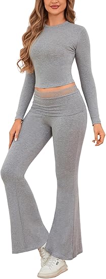 Women's Workout 2 Piece Lounge Sets Long Sleeve Tops Foldover Flare Pants Casual Outfits Tracksuit