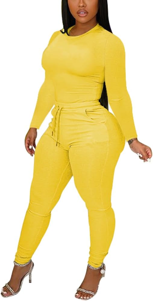 Womens Two Piece Outfits Bodycon Tracksuit Sweatsuits Solid Jogger Workout Gym Biker Lounge Long Sleeve Pant Sets