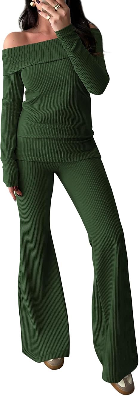Women 2 Piece Outfits Fall Long Sleeve Off The Shoulder Slit Top Long Flared Pant Set Rib Knit Lounge Sets