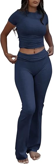 Casual Workout Two Piece Outfits for Women Short Sleeve Crop High Waist Foldover Flare Pants Tracksuit Sets Streetwear
