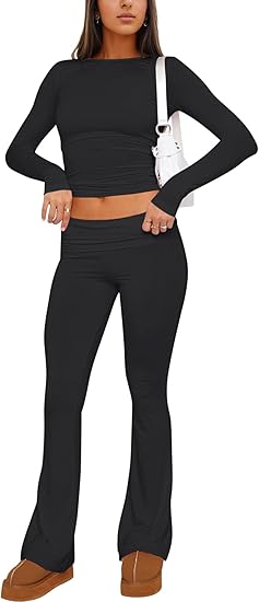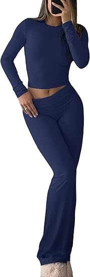 Workout 2 Piece Set Outfits for Women Fold-over Flare Pants Set Lounge Ribbed Knit Pajamas Set Leggings Sets